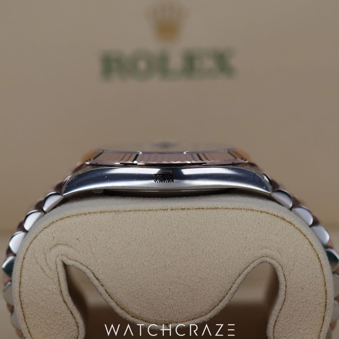 This model’s two-tone harmony, blending Oystersteel with Rolex’s signature 18 ct Everose gold, creates a symphony of metals that dazzles with understated opulence. The fluted bezel, a hallmark of the Datejust line, catches the light with every movement, echoing the brilliance that Rolex is celebrated for.