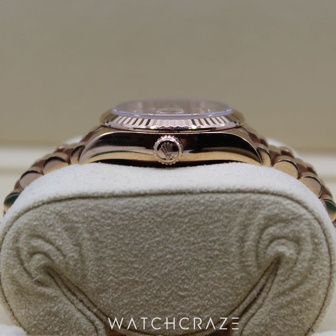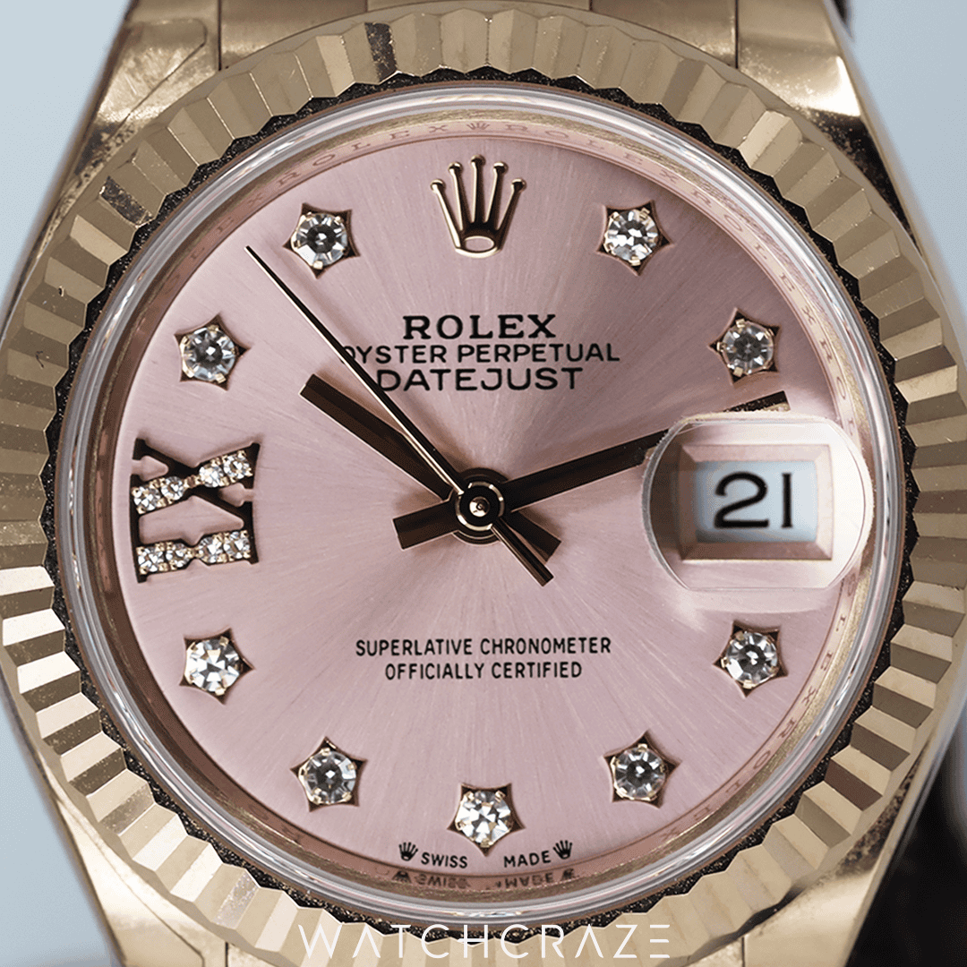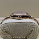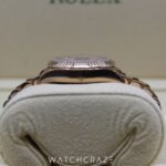 This watch exudes warmth and sophistication thanks to its 28mm case made of lustrous Everose gold, a distinctive blend of Rolex’s special 18 ct pink gold alloy. The bezel, which is encrusted with magnificent diamonds, provides some glitz and heightens its attractiveness. Each glance at the watch is a pleasure because to the white mother-of-pearl dial’s stunning interplay of light and colour, which is skilfully created and enhanced by diamond hour markers.