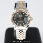 The combination of Oystersteel and 18 ct Everose gold, Rolex’s renowned 18 ct rose gold blend, enhances the watch’s opulent appearance. Its shiny green dial, which is embellished with diamonds or Roman numerals (depending on the variation), exudes an alluring sense of freshness and individuality.
