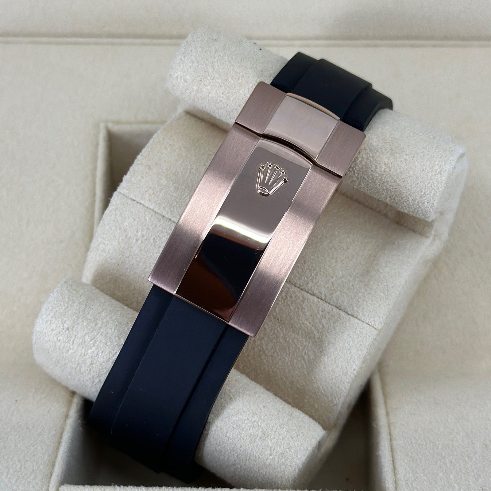The chocolate dial looks great against the rose gold case. The Oysterflex bracelet, patented by Rolex, is the perfect combination of a rubber strap and a metal bracelet.