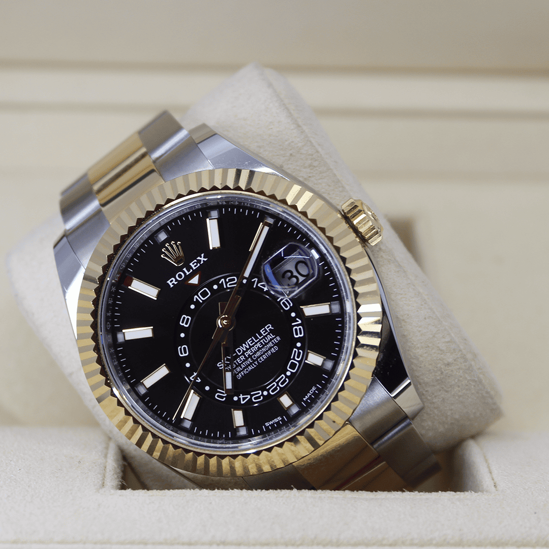 The Rolex Calibre 9001 powers the Two Tone Sky-Dweller. The watch is precise and reliable with a 72-hour power reserve and Superlative Chronometer certification.