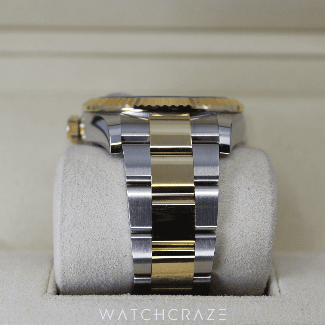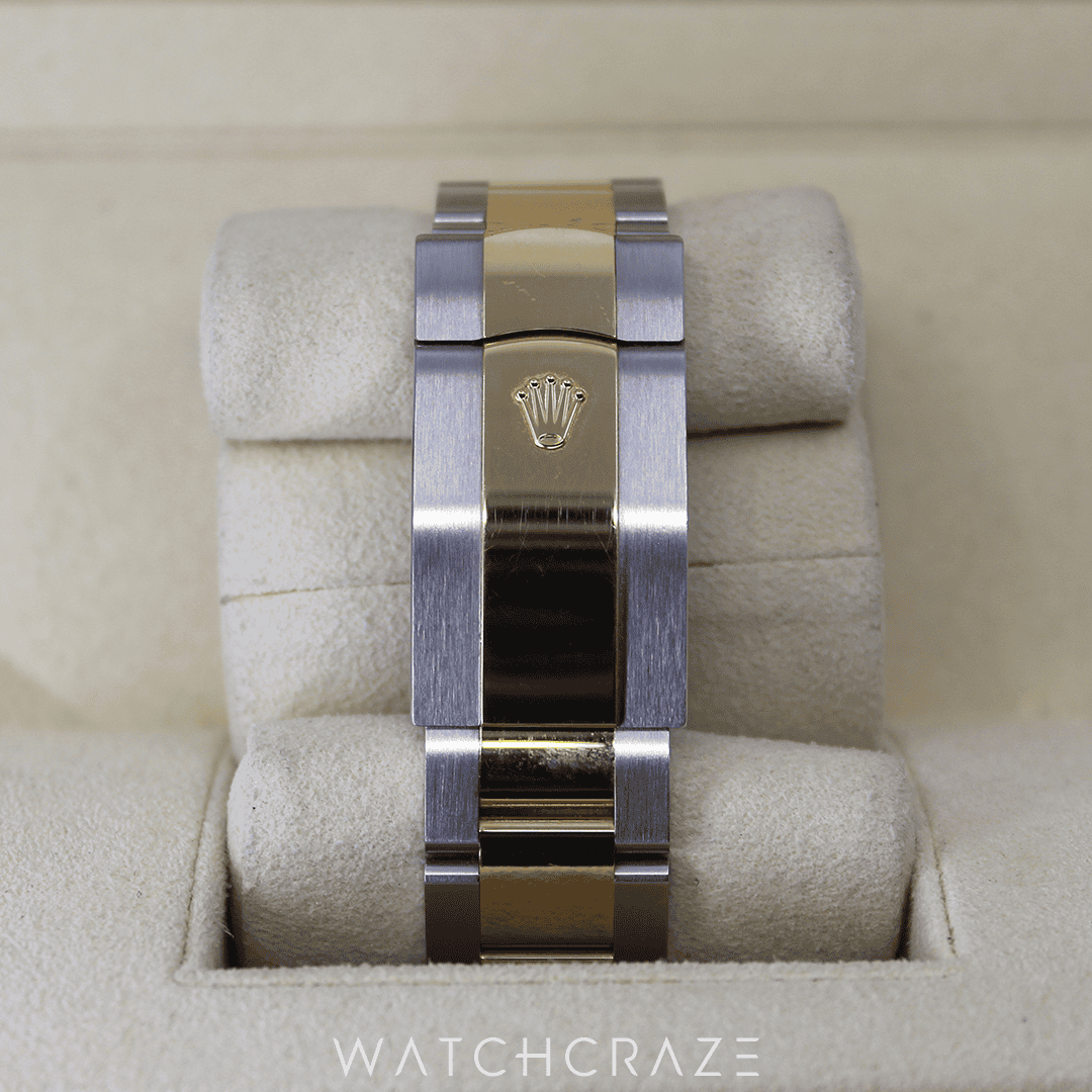 The two-tone Oyster bracelet matches the case’s 18ct yellow gold and Oystersteel. Oysterlock safety clasp and Easylink 5mm comfort extension link make the bracelet comfortable.