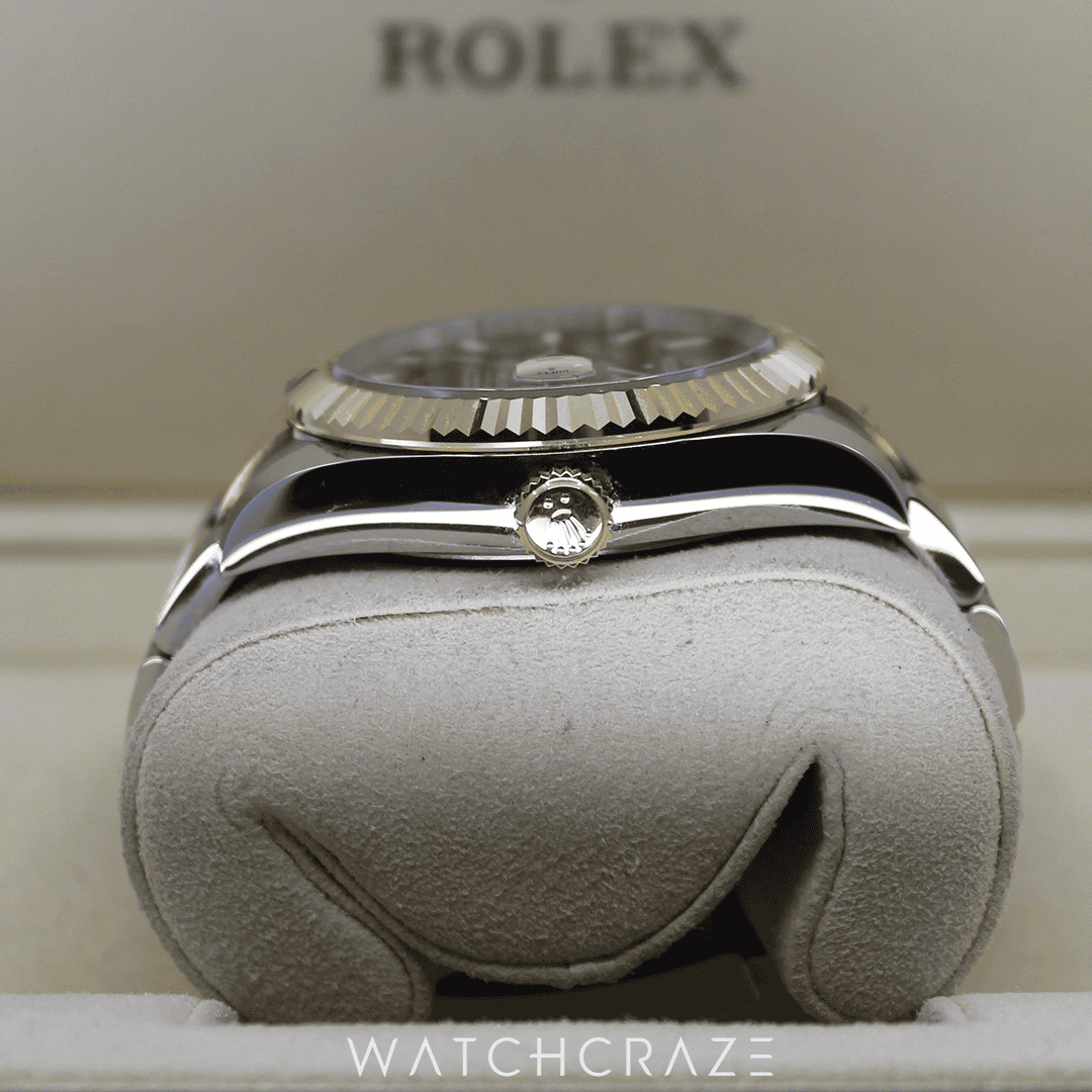 Rolex’s Oystersteel and 18ct yellow gold, known as Rolesor, form the 42mm case’s sturdy construction. This combination gives the watch strength and beauty. The case’s fluted 18ct yellow gold bezel controls the watch’s Ring Command system and enhances its beauty.